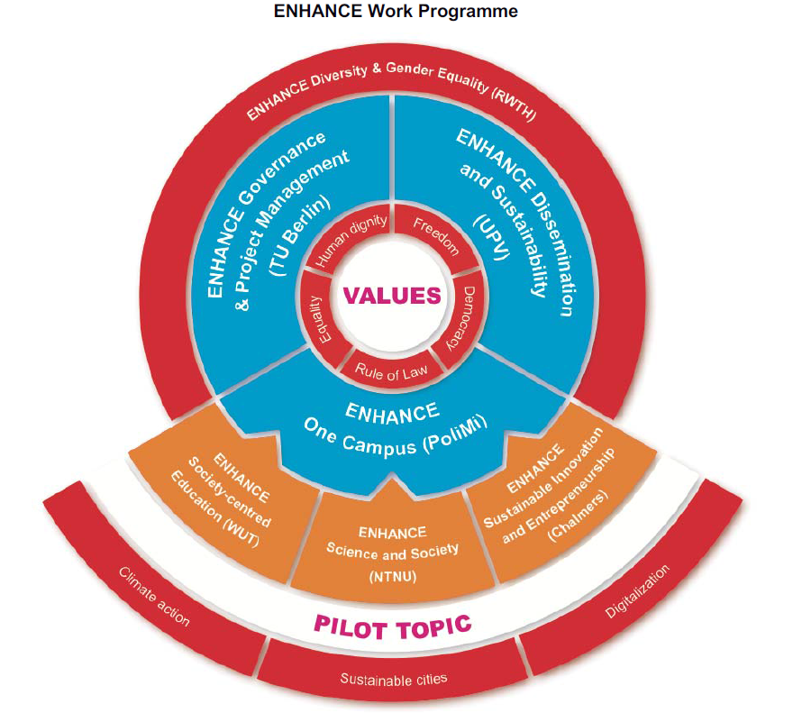 During the three-year funding period, ENHANCE will lay the foundations for an innovative European University of Technology, spanning six countries, which enables and accelerates the European Education Area. Guided by the concepts of integration and innovation, we will establish the structures for a strong and sustainable Alliance to fulfil our central long-term vision:
